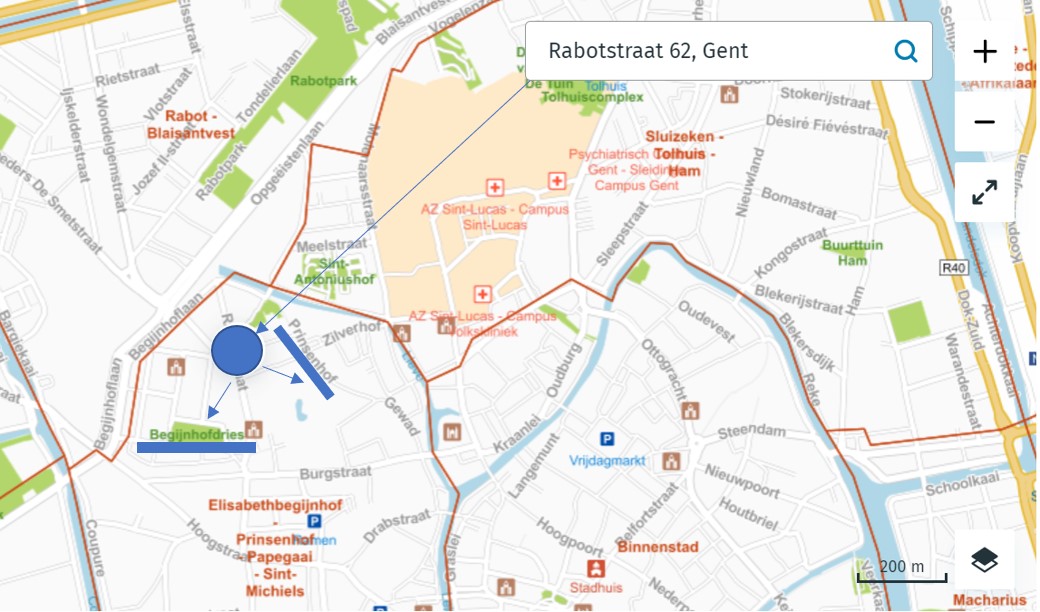 De rabotstraat snijdt als het ware het begijnhof en het prinsenhof in twee. Verlaat je het pand via de achterdeur dan kom je terecht in het park Bachtenwallen wat grenst aan het prinsenhof. Dit is de ideale uitgangsweg om met de fiets naar de binnenstad te rijden. Op nog geen 5min rijden sta je aan het Gravensteen.